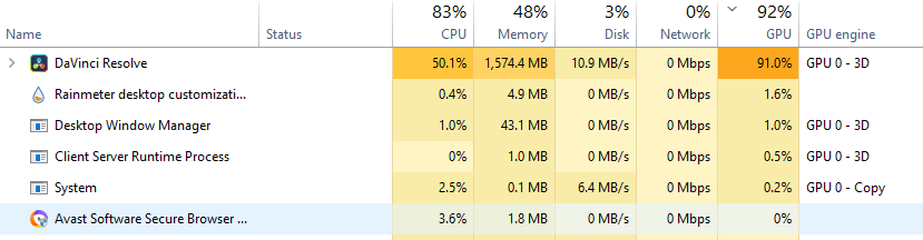 If you guys are Out of Loop™ and want me to explain why I can't work on BahSA. That is because Davinci Resolve is just hogging up WAAAY too much of my GPU. This is a screen capture of Davinci Resolve being the only main program running, yet it is EATING up my GPU. I can barely get it at a stable FPS for proper work!
